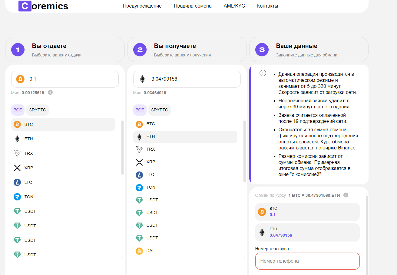 Мы не рекомендуем обменивать криптовалюту в Coremics из-за высокого риска потери ее.