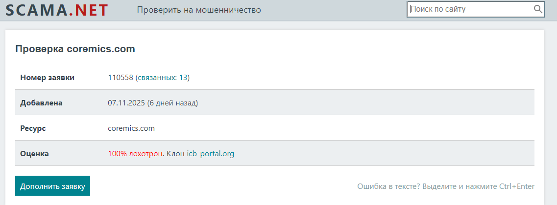 Проверка ресурса организации на странице проекта Scama net показала, что он является клоном Icb-Portal log. Система пишет, что проект – 100% лохотрон.