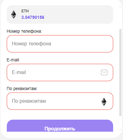 Проект не требует регистрации для взаимодействия с терминалом сайта. Пользователю достаточно ввести номер телефона, электронную почту и указать реквизиты криптовалютного кошелька или карты, чтобы запустить процесс обмена крипты.