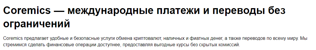 Сайт организации локализован под русскоязычных пользователей. Клиенты смогут обменять монеты, токены и фиатные деньги в терминале на главной странице. Калькулятор, встроенный в интерфейс Coremics, поможет определить количество получаемых монет при обмене.