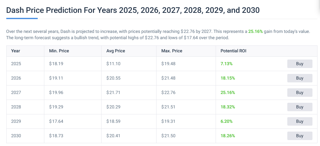 По данным CoinCodex, до конца 2025 года возможен рост Dash на +7%. Но уже со следующего года ожидается прирост на 18-25%. К 2030 году цена токена может достигнуть 21,5 долларов.