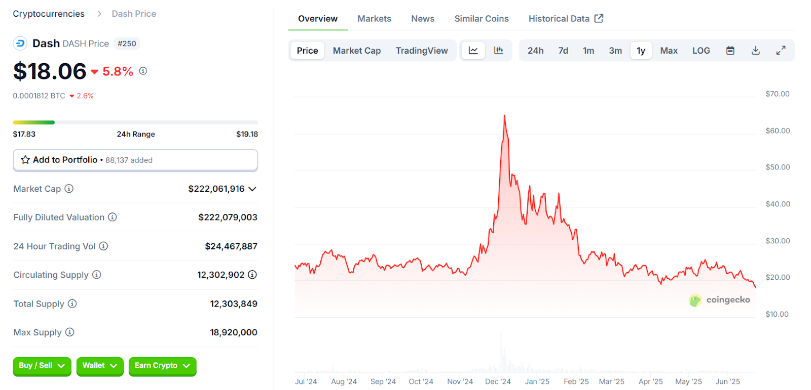 По состоянию на июнь 2025 года крипта Dash торгуется по цене около 18,06 долларов. Суточные изменения стоимости составляют 5,8%.