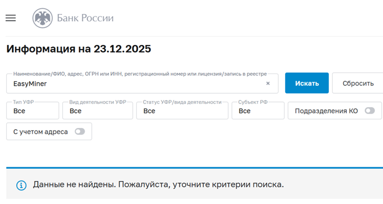 На сайте Easyminer Net обещают гарантированный доход. Майнинг – рискованная деятельность, прибыльность которой зависит от курса. Гарантированные обещания – ловушка для клиентов. Но представленный сервис работает без лицензии Центрального Банка РФ, что подтверждает его незаконную деятельность.