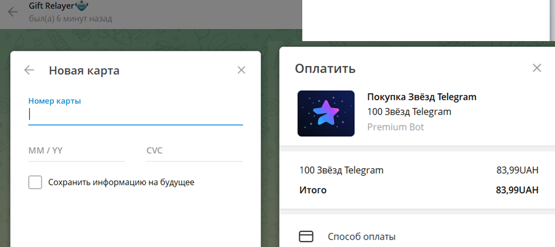 На практике это выглядит так: человек либо покупает звезды напрямую через официальный интерфейс тг, либо ему показывают, что подарок уже якобы начислен, но для его активации, перевода или вывода нужно выполнить дополнительные действия. Такие действия связаны с донатом звезд, подтверждением операций или переходами между ботами.