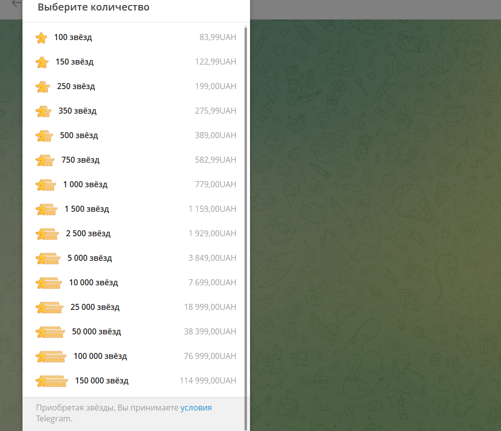 Боты используют официальный интерфейс Telegram Stars, показывают стандартное окно покупки звезд через Premium Bot, цены указаны в локальной валюте, перед оплатой предлагается согласиться с официальными условиями телеграмм.