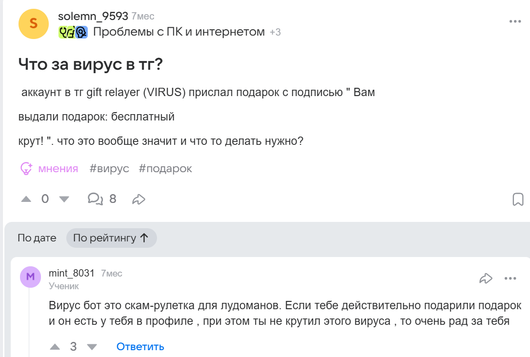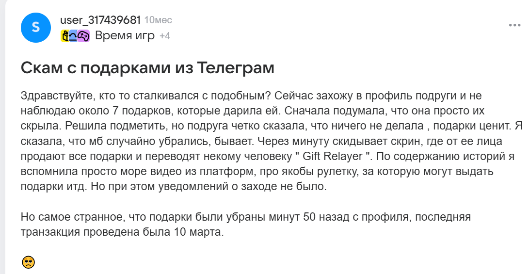 Далее либо бот запрашивает дополнительные звезды, либо подарок якобы автоматически уходит в оборот. В итоге подарки исчезают, а доказать что-либо практически невозможно.
