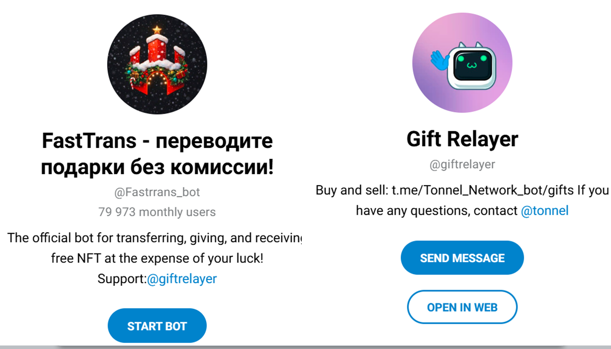Это создает ощущение легальности, особенно у тех, кто привык покупать звезды, подарки или подписки внутри мессенджера. В описании FastTrans указано, что бот является официальным инструментом для перевода и получения NFT, а у бота Гифтрелайер есть поддержка и внешние разделы.