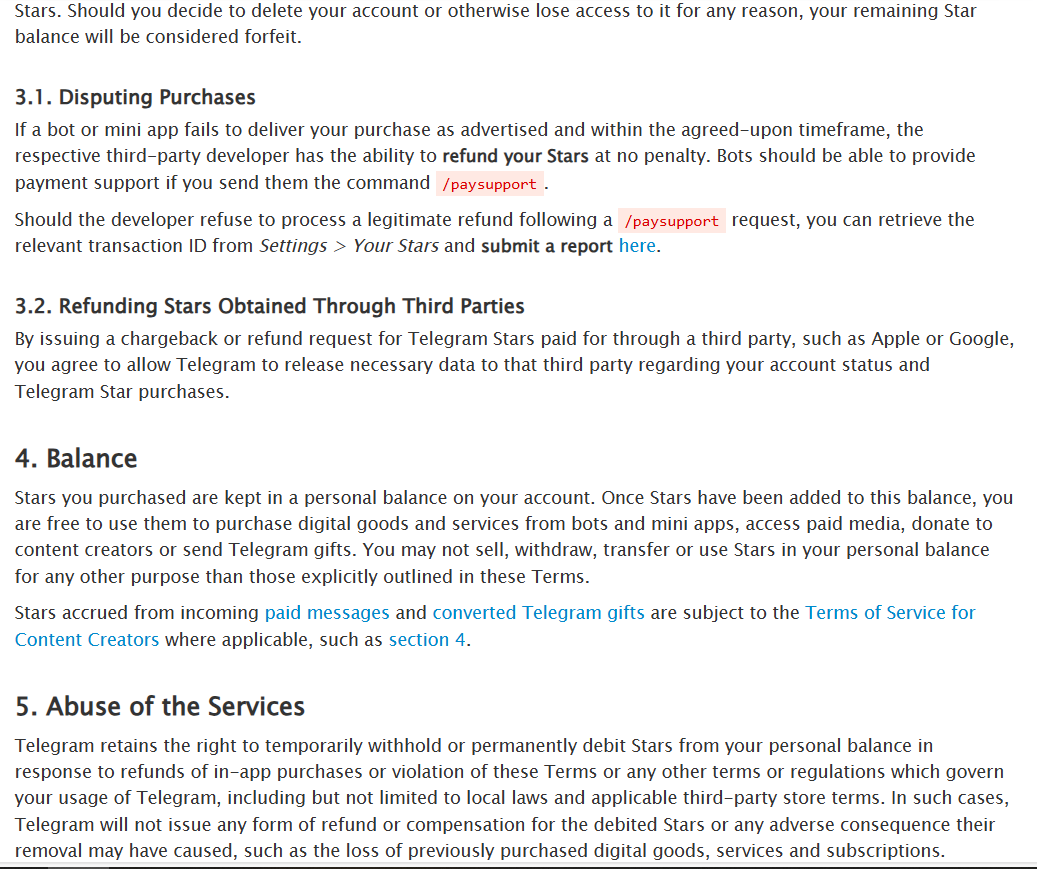 Боты прикрываются условиями Telegram Stars, где указано, что тг не обрабатывает платежи, не несет ответственности за сторонние боты, не гарантирует возвраты и может в любой момент списывать звезды при нарушении правил или по запросу платежных систем. Также указано, что все покупки звезд окончательные, возвратов нет, а при удалении аккаунта баланс сгорает.
