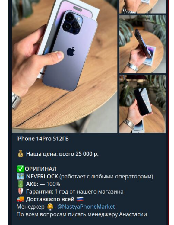 На сайтах сохранились скриншоты с предложениями по покупке техники Apple, например, iPhone 14 Pro 512Gb стоит всего ₽25,000, хотя на «Яндекс Маркет» цены начинаются от ₽94,000, причем владельцы канала в Телеграм утверждают, что продукция оригинальная.