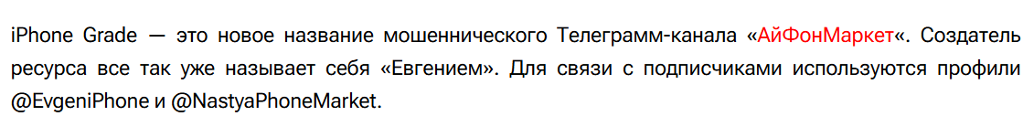 Обзор магазина в Телеграмм iPhone Grade: отзывы о сотрудниках EvgeniPhone и NastyaPhoneMarket, связь с «АйфонМаркет», сравнение цен и анализ деятельности «Айфон Грейд»