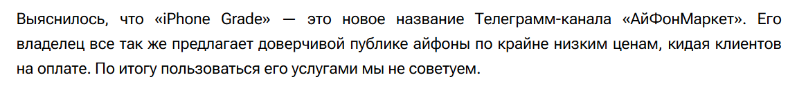 Мы изучили проект и отзывы о iPhone Grade и выяснили, что в августе 2025 года даже ссылки на канал в сети нет, поэтому проект, скорее всего, вообще закрылся, но оставил о себе только негативные впечатления.