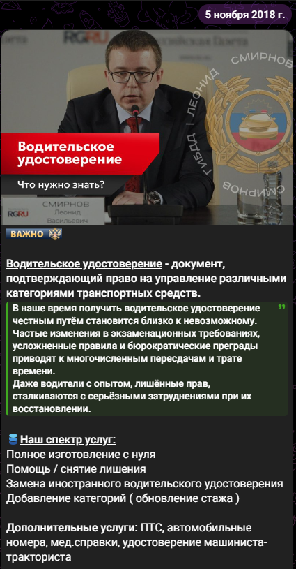 «Леонид Смирнов | ГИБДД» – это телеграмм-канал, который помогает получить водительские права «без лишних хлопот». В обзоре проанализируем историю развития проекта, оказываемые услуги и отзывы реальных клиентов.