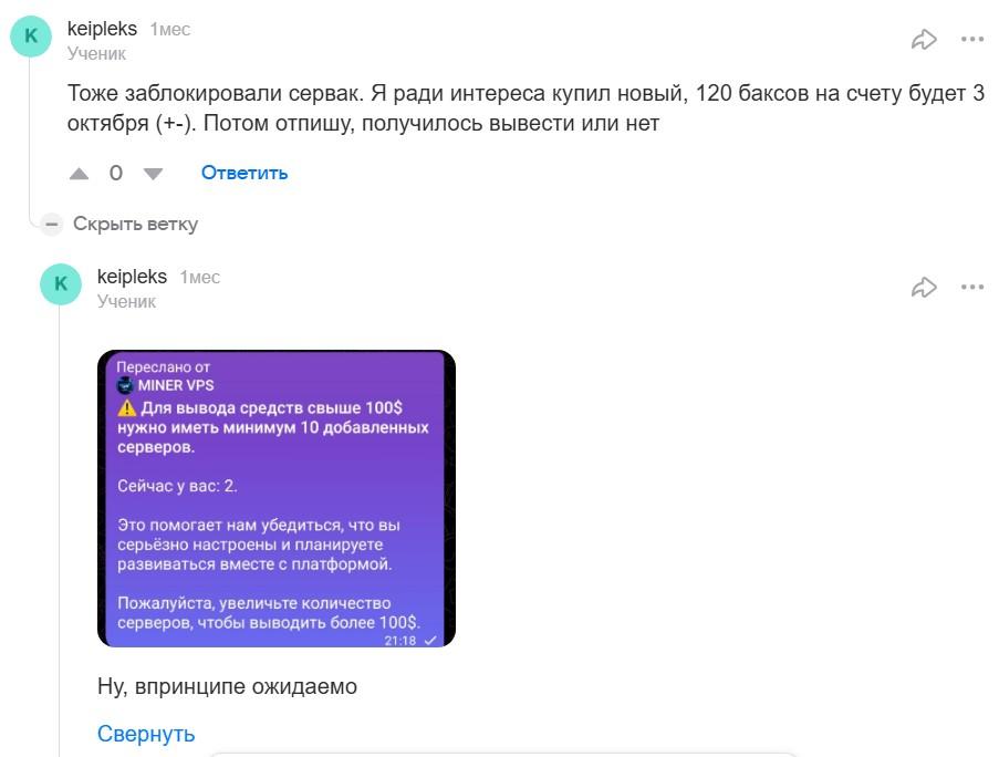 Отзывы про бот «Майнер ВПС» в ТГ показывают, что это развод. Один пользователь написал, что ему заблокировали вывод средств. Объяснили тем, что для перевода денег нужно, чтобы на всех серверах была прибыль не меньше 2 500 долларов.