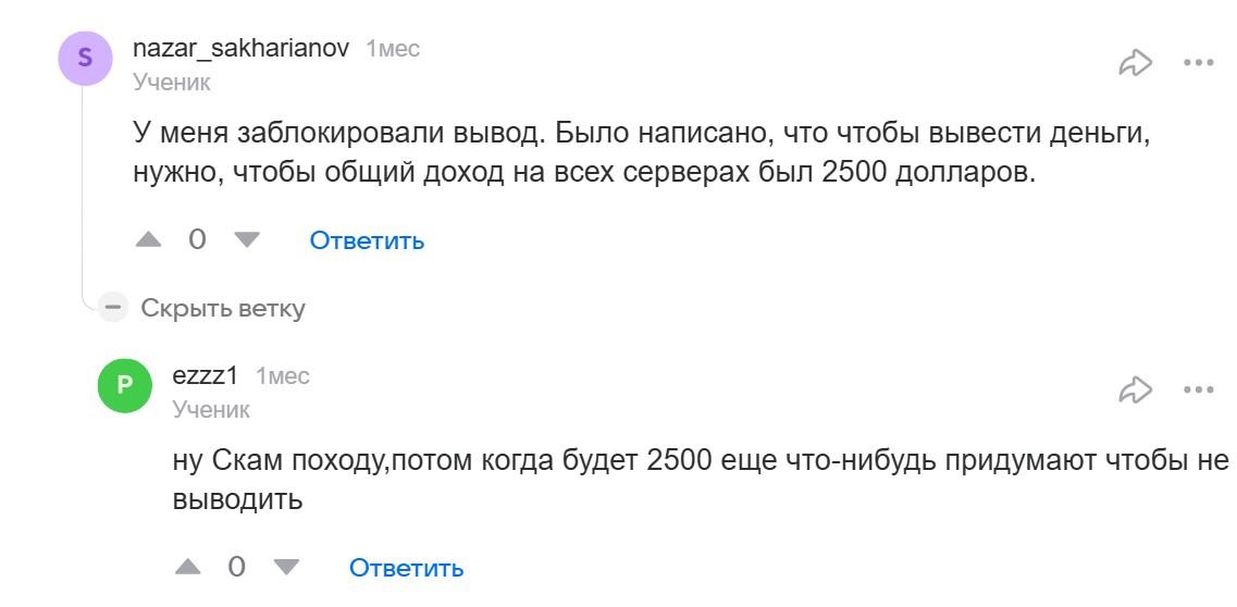Другой клиент тоже рассказал, что ему не дали вывести доход, сказали, что нужно подключить 10 серверов для вывода более 100 долларов.