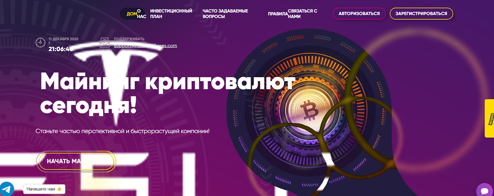 Доменное имя MiningXShares com зарегистрировано в середине октября 2025 года. Сайт сделан шаблонный, неудобный, из контактов на нем есть электронная почта support miningxshares com и Телеграмм аккаунт Elon reeve musk4411, вряд ли использование чужого имени можно отнести к факторам надежности конторы. Но организация убеждает пользователей, что ведет легальную деятельность, ее офис находится в Техасе, а регистрация проведена в Великобритании еще в 2020 году. На платформе даже опубликован соответствующий документ, доверять которому не имеет смысла. Если владелец проекта прикрывается именем миллиардера, что мешает ему присвоить чужие документы?