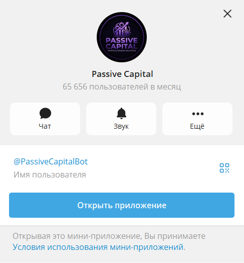 ТГ-бот @PassiveCapitalBot по состоянию на январь 2026 насчитывает 65 656 пользователей в месяц. В приветственном сообщении нет подобной информации о проекте: неизвестно, кто стоит за созданием, какие были вехи развития и в чем заключается миссия платформы. Юридических сведений также не представлено – вероятно, работа компании никем не регулируется вовсе.
