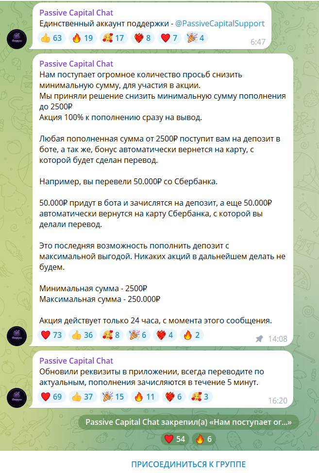 В целом отсутствие юридической информации, официального тг-канала, перерывы в работе поддержки бота «Пассив Капитал» несколько подрывают к нему доверие.