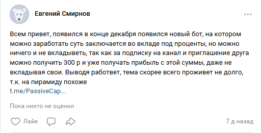 Все это делает телеграм-проект Passive Capital Bot похожим на развод. Что по этому поводу говорят пользователи в интернете, найти не удалось – отзывов нет. Лишь один из пользователей во «ВКонтакте» заявил, что проект похож на пирамиду.
