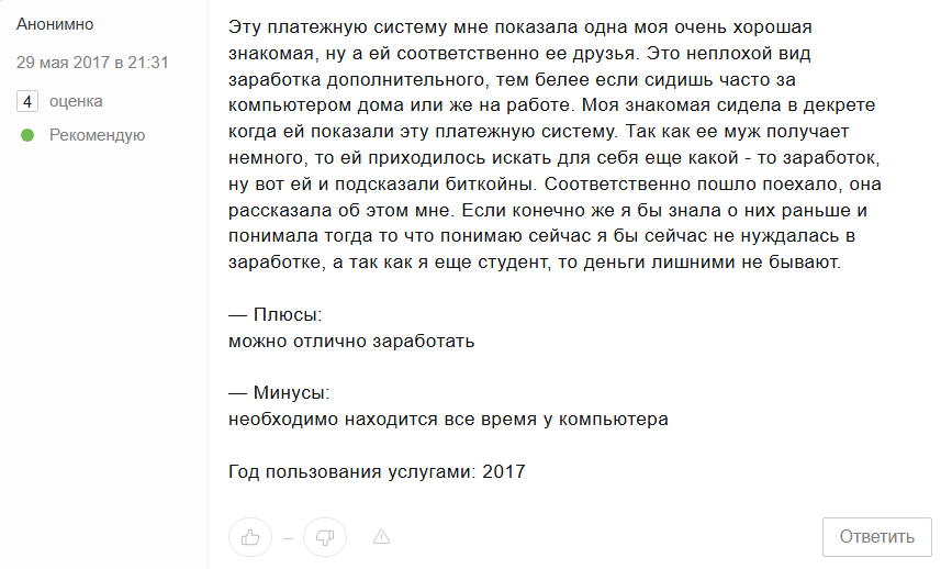 Платежная система Биткоин отзывы имеет противоречивые. Как и все подобные решения. В одних пишут, что это неплохой способ заработка. Другие заявляют, что не советуют с ней связываться, так как непонятна экономическая модель.