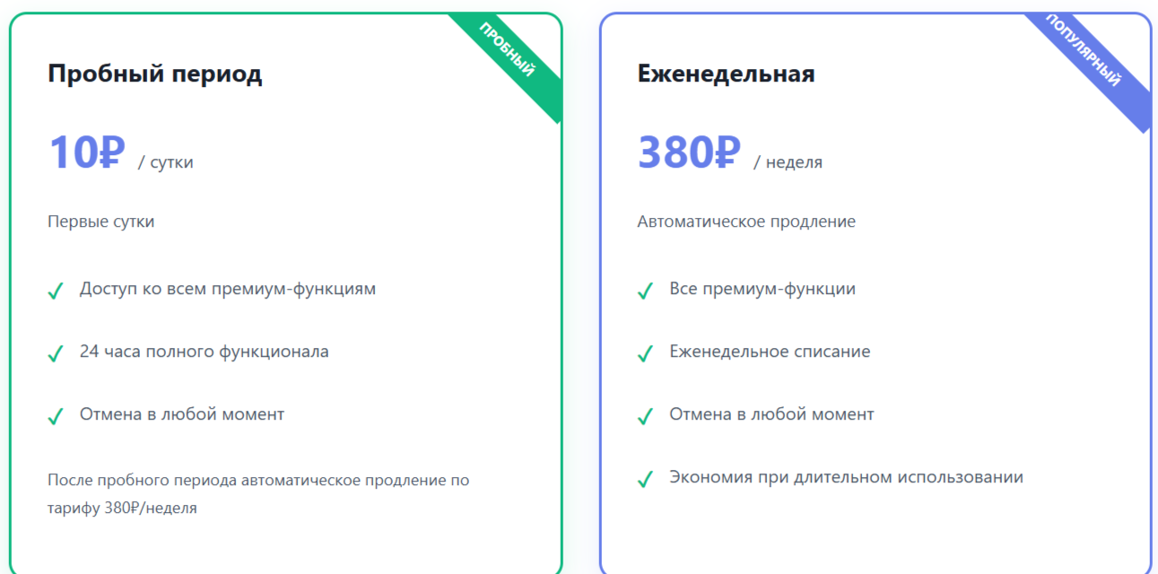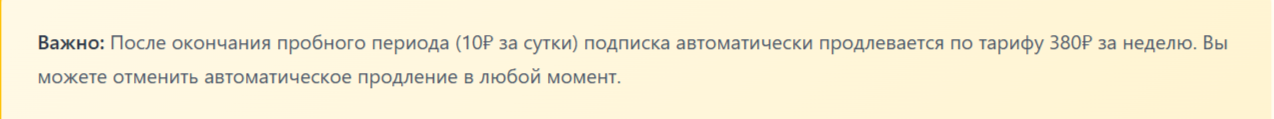 - пробный период: ₽10, доступен только в первые сутки;