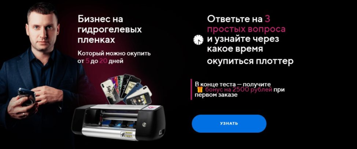 Автор проекта «Бизнес с Китаем» Сергей Данилюк предлагает приобретать его курсы, в которых он рассказывает об идеях для бизнеса, которые развивают китайцы и которые он находит перспективными. Например, Сергей предлагает создать по его методикам бизнес на гидрогелевых пленках, обещая, что он окупится за время от 5 до 20 дней. Чтобы получить бонусы, можно проходить тесты с простыми вопросами и получать скидки на первый заказ.