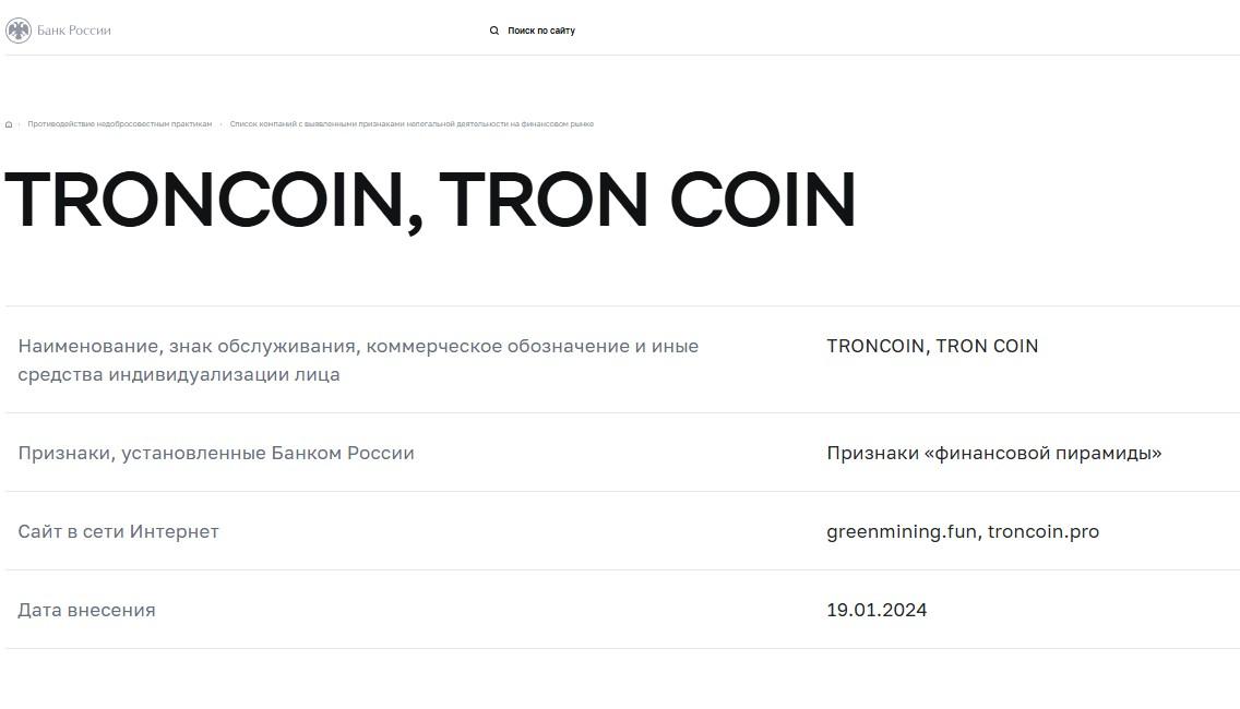 На сайте нет информации о разработчиках проекта. Не размещены документы, подтверждающие, что майнинговая компания оформлена юридически. В интернете сведений о такой фирме найти не удалось, словно она не существует. Вероятно, платформа работает незаконно.В черном списке ЦБ РФ мы нашли компанию с таким же названием. Но сайты там указаны другие – greenmining.fun и troncoin.pro. Предполагаем, что они относятся к владельцам этого проекта, так как внешне оформлены очень похоже. Центробанк России выявил в их деятельности признаки финансовой пирамиды.