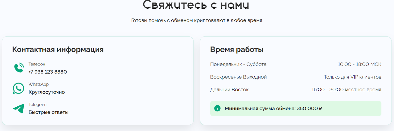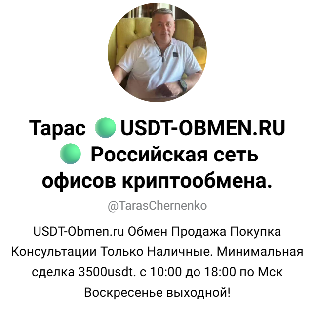 Связаться с менеджером можно по указанному телефону, через аккаунты WhatsApp и Telegram – Тарас USDT OBMEN RU Российская сеть офисов криптообмена, @ TarasChernenko. Пользователи могут оставить заявку или проконсультироваться по телефону – с понедельника по субботу с 10:00 до 18:00, в соцсетях – круглосуточно. В воскресенье могут обращаться только vip-клиенты. Руководит российской сетью офисов криптообмена Тарас Черненко, его личность предварительно подтверждена – имя и фото мужчины совпадают с другими аккаунтами в соцсетях. О наличии ИП данных нет.Из сторонних источников известно, что ранее Тарас Черненко занимался экспертизой автомобилей и подбором авто под ключ. Отклики о его деятельности положительные.