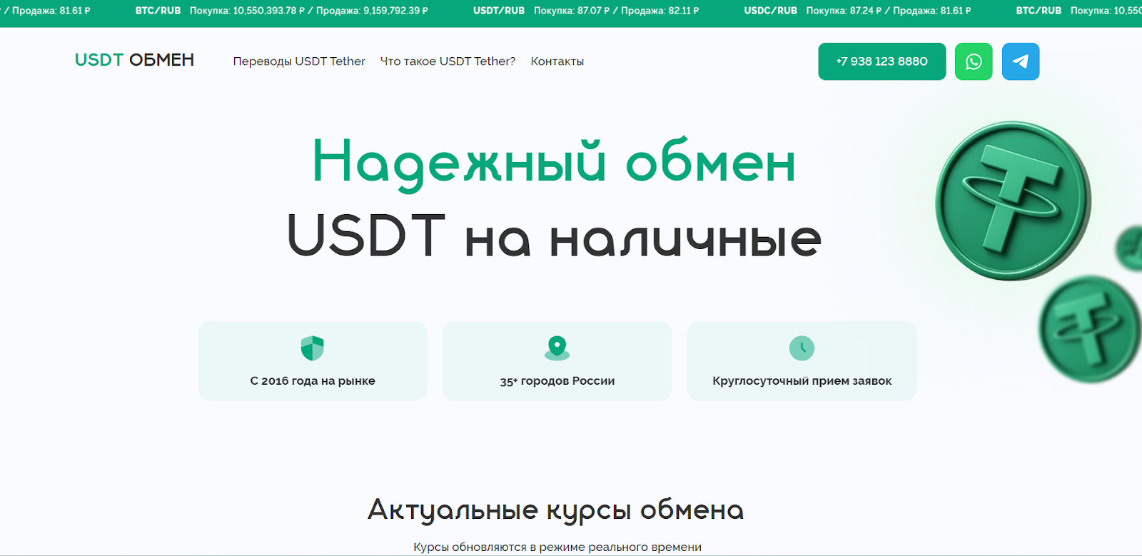 Usdt obmen – площадка для обмена криптовалюты, о надежности которой при первом посещении платформы говорит только соответствующая надпись на главной странице сайта. Как заявлено на проекте, офисы обменника работают более чем в 35 городах России. Компания оказывает услуги с 2016 года. Рассмотрим далее в обзоре, стоит ли останавливаться на данном оффере обмена крипты или лучше отдать предпочтение его конкурентам.