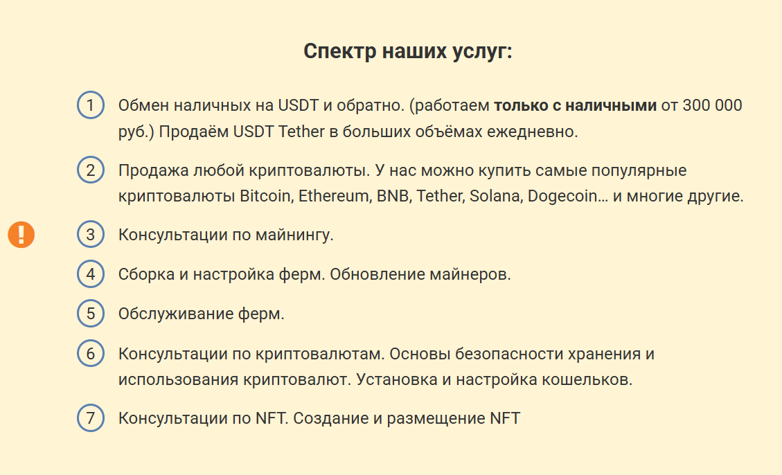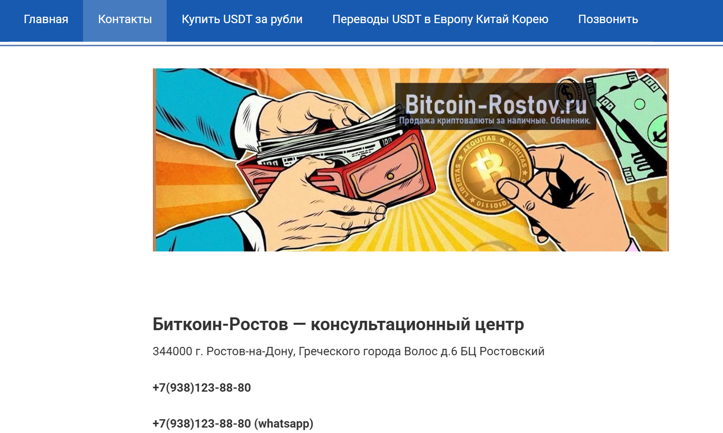 Еще одна площадка компании – bitcoin-rostov ru, здесь указан тот же номер телефона. Bitcoin Ростов также оказывает услуги по двухстороннему обмену между USDT и валютой. В спектр услуг входит сборка и настройка, обслуживание крипто ферм, консультации по майнингу, криптовалютам и NFT.