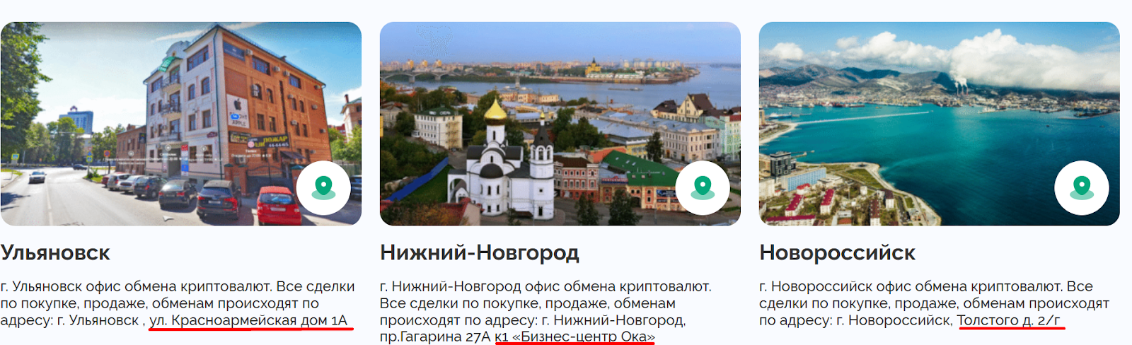 Далее на сайте USDT ОБМЕН можно ознакомиться со списком всех городов, в которых находятся офисы организации. Представлены адреса зданий или торговых центров без указания офисов. На ресурсе упомянуто, что все приемные расположены в зданиях с пропускной системой контроля и для посетителя необходимо выписать пропуск. Поэтому клиент предварительно может ознакомиться с примерной локацией потенциальной сделки, а уточнить конкретные детали, очевидно, нужно связавшись с менеджером.