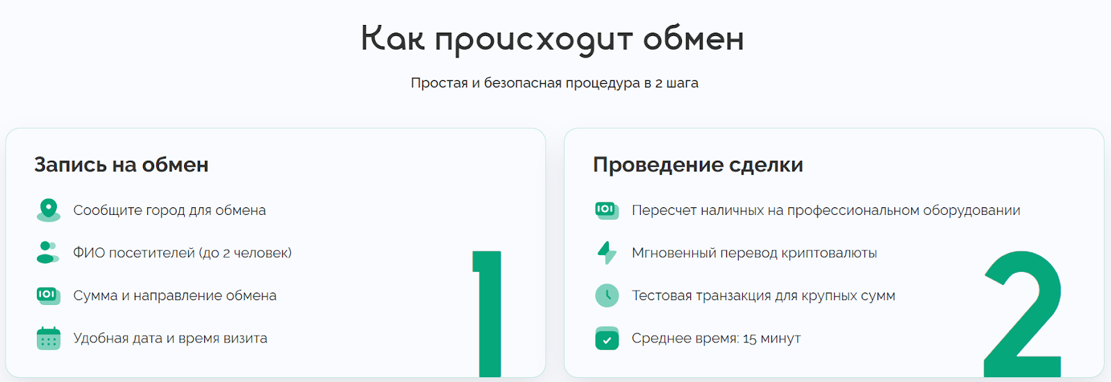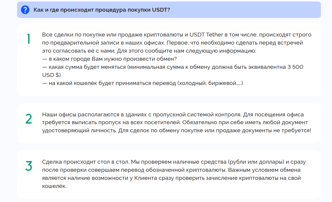 На сайте указан строгий алгоритм процедуры покупки стейблкоина Tether. Сделки проводятся в офисе только по предварительной записи. До оффлайн встречи нужно оставить заявку с указанием офиса обмена, предварительной суммой обмена и вида кошелька для перевода крипты. Также согласовываются дата и время визита, для крупных сумм проводится тестовая транзакция. Покупатель должен убедиться в своей возможности сразу проверить зачисление крипты. Также отметим, что компания гарантирует клиентам полную анонимность и обещает планировать график визитов таким образом, чтобы посетители не пересекались между собой.