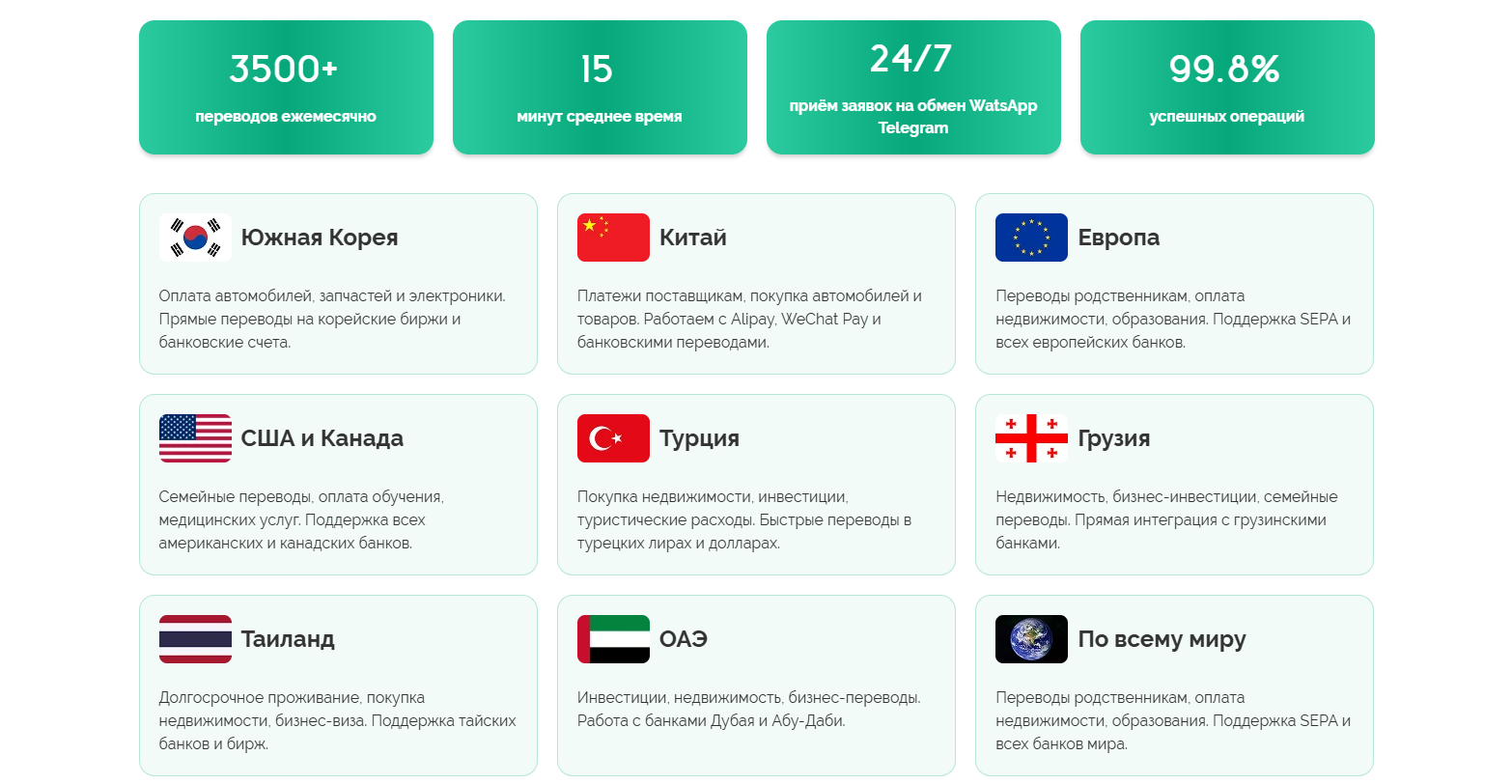 Компания работает только с крупными клиентами – минимальная сумма для обмена должна быть эквивалента от 35 тыс. USDT или от 350 тыс. рублей. На сайте приведены примеры целевых потребностей некоторых клиентов площадки. Это обмены для оплаты автомобилей, заказанных из других стран, покупка и продажа недвижимости за границей, например в Турции, Таиланде и др. Также одной из популярных причин сделок является финансовая поддержка близких из других стран. Согласно указанной статистике, ежемесячно через офисы конторы осуществляется свыше 3500 сделок.