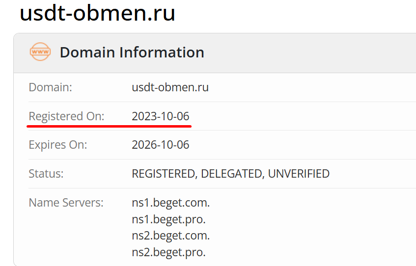 Доменное имя ресурса было зарегистрировано в октябре 2023 года, на момент обзора он работает около 2-х лет.