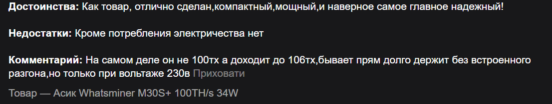 Асики, которые вы можете найти на Whatsminer com, отзывы преимущественно положительные. Люди отмечают высокий уровень качества, в сравнении с конкурентами, надежность и удобство. Среди недостатков отмечается высокое энергопотребление. Большой выбор позволяет подобрать подходящий вариант для своей сборки.