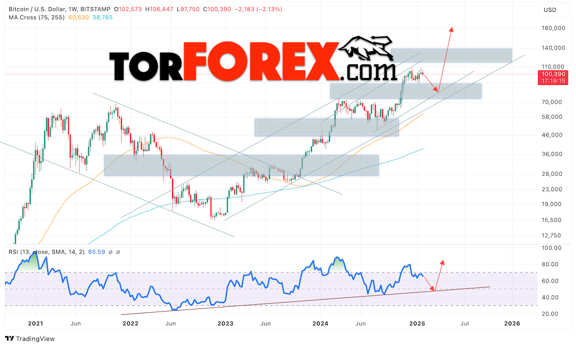 Дополнительным сигналом в пользу роста котировок BTCUSD выступит тест бычьей линии тренда на индикаторе относительной силы. Вторым сигналом в пользу этого варианта станет отскок от нижней границы бычьего канала. Отменой варианта роста курса Bitcoin выступит снижение стоимости монеты и пробой области 70105. Это укажет на закреплением под уровнем поддержки и продолжение падения курса Bitcoin с потенциальной целью на отметке 60405. Подтверждением бычьего сценария в январе 2025 года станет пробой области сопротивления с закреплением цены выше отметки 110605.
