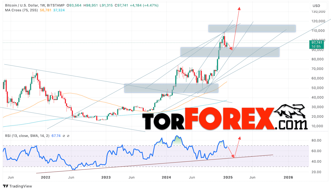 Дополнительным сигналом в пользу роста котировок BTCUSD выступит тест бычьей линии тренда на индикаторе относительной силы. Вторым сигналом в пользу этого варианта станет отскок от нижней границы бычьего канала. Отменой варианта роста курса Bitcoin выступит снижение стоимости монеты и пробой области 80205. Это укажет на закреплением под уровнем поддержки и продолжение падения курса Bitcoin с потенциальной целью на отметке 65605. Подтверждением бычьего сценария в январе 2025 года станет пробой области сопротивления с закреплением цены выше отметки 110205.