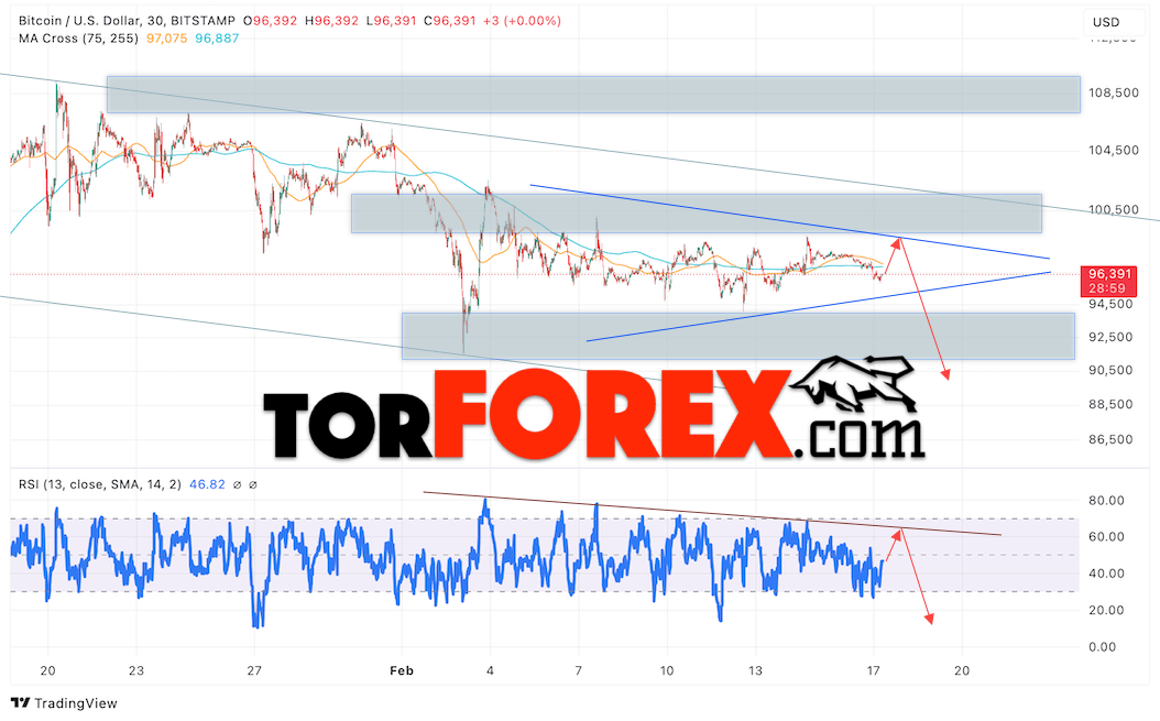 Котировки BTCUSD торгуются на уровне 96232 и продолжают движение в рамках развития падения и формирования модели «Треугольник». Скользящие средние указывают на наличие краткосрочной бычьей тенденции по Bitcoin. Цены пробили область между сигнальными линиями вниз, что указывает на давление со стороны продавцов «Цифрового Золота» и потенциальное продолжение падения стоимости актива уже с текущих уровней. В рамках прогноза курса криптовалюты на завтра 18 февраля 2025 стоит ожидать попытку развития бычьей коррекции цифрового актива и тест уровня сопротивления вблизи области 97605. Откуда вновь стоит ожидать отскок вниз и попытку продолжения падения курса Bitcoin с целью ниже области 90565.