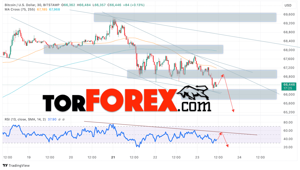 Дополнительным сигналом в пользу снижения котировок BTC/USD выступит тест линии сопротивления на индикаторе относительной силы. Вторым сигналом в пользу этого варианта станет отскок от верхней границы медвежьего канала. Отменой варианта снижения курса монеты и стоимости Bitcoin станет сильный рост стоимости актива и пробой области 67665. Это укажет на пробой области сопротивления и продолжение роста курса Bitcoin с потенциальной целью на уровне 72045. Подтверждением падению цены актива выступит пробой области поддержки с закреплением цены ниже отметки 65885.
