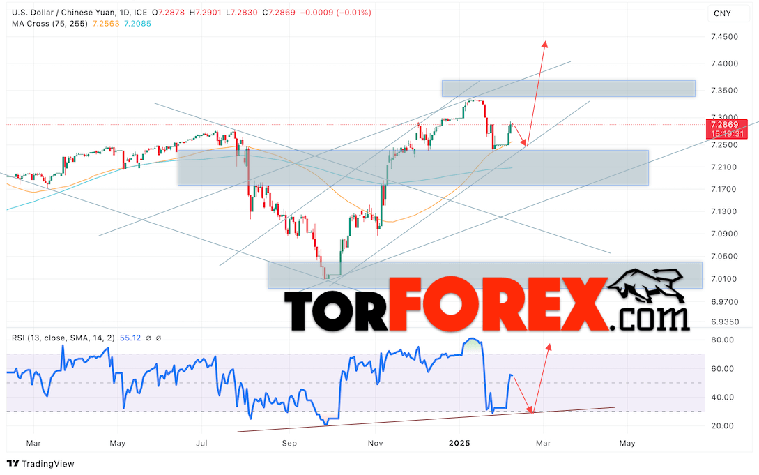 Валютная пара Доллар Китайский Юань USDCNY завершает торговую неделю в рамках роста и восходящего канала. В момент публикации прогноза курс Доллара США к Китайскому Юаню составляет 7.2869. Скользящие средние указывают на наличие краткосрочной бычьей тенденции. Цены пробили область между сигнальными линиями вверх, что указывает на давление со стороны покупателей американской валюты и потенциальное продолжение роста Доллара США против Китайского Юаня. В рамках прогноза курса Доллара на 10 — 14 февраля 2025 стоит ожидать попытку развития медвежьей коррекции цены и тест уровня поддержки вблизи области 7.2515 Юаней за Доллар США. Затем, отскок вверх и продолжение роста валютной пары в область выше уровня 7.4505.