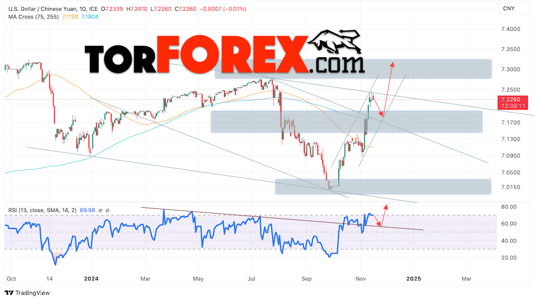 Дополнительным сигналом в пользу роста валютной пары USD/CNY 18 — 22 ноября 2024 выступит тест пробитой линии тренда на индикаторе относительной силы (RSI). Вторым сигналом станет отток от нижней границы бычьего канала. Отменой варианта роста пары USD/CNY на Форекс станет падение котировок и пробой уровня 7.1305 Юаней за Доллар. Это укажет на пробой области поддержки и продолжение падения пары Доллар Китайский Юань в область ниже уровня 7.0505. Подтверждением росту пары выступит пробой области сопротивления и закрытие котировок актива над уровнем 7.2605, что укажет на пробой верхней границы нисходящего канала.
