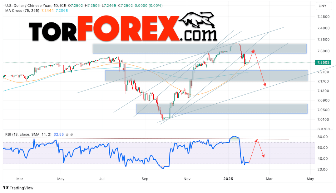 Дополнительным сигналом в пользу падения валютной пары USD/CNY 3 — 7 февраля 2025 выступит отбой от области сопротивления на индикаторе относительной силы (RSI). Вторым сигналом станет отток от нижней границы бычьего канала. Отменой варианта падения пары USD/CNY на Форекс станет сильный рост котировок и пробой уровня 7.3345 Юаней за Доллар. Это укажет на пробой области сопротивления и продолжение роста пары Доллар Китайский Юань в область выше уровня 7.3955. Подтверждением падению пары выступит пробой области поддержки и закрытие котировок актива под уровнем 7.2165, что укажет ан пробой очередного бычьего канала коррекции.