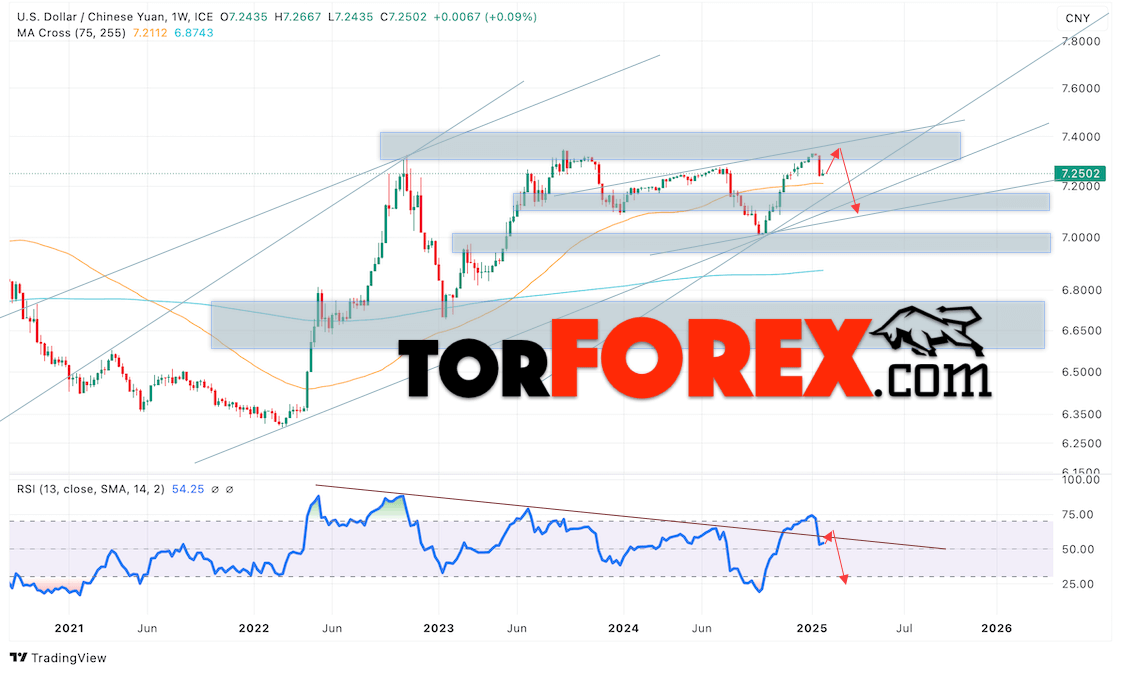 Дополнительным сигналом в пользу снижения валютной пары USD/CNY в феврале 2025 выступит отбой от медвежьей линии тренда на индикаторе относительной силы (RSI). Вторым сигналом станет отток от верхней границы бычьего канала. Отменой варианта падения пары USD/CNY на Форекс станет сильный рост котировок и пробой уровня 7.3605 Юаней за Доллар. Это укажет на пробой области сопротивления и продолжение роста пары Доллар Китайский Юань в область выше уровня 7.4205. Подтверждением снижению пары выступит пробой области поддержки и закрытие котировок актива под уровнем 7.2105.
