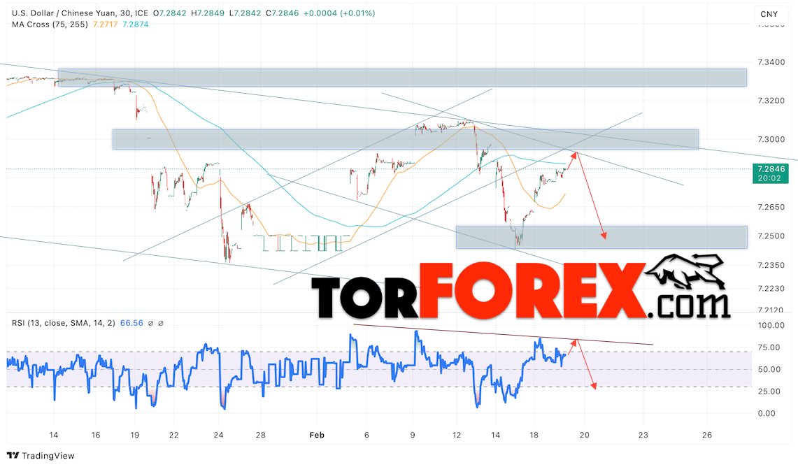 Дополнительным сигналом в пользу снижения валютной пары USD/CNY 20 февраля 2025 выступит тест медвежьей линии тренда на индикаторе относительной силы (RSI). Вторым сигналом станет отскок от верхней границы медвежьего канала. Отменой варианта с падением пары USD/CNY на Форекс станет сильный рост котировок и пробой уровня 7.3065 Юаней за Доллар. Это укажет на пробой области сопротивления и продолжение роста пары Доллар Китайский Юань в область выше уровня 7.3375. Подтверждением падению валютной пары выступит пробой области поддержки и закрытие котировок актива под уровнем 7.2655.