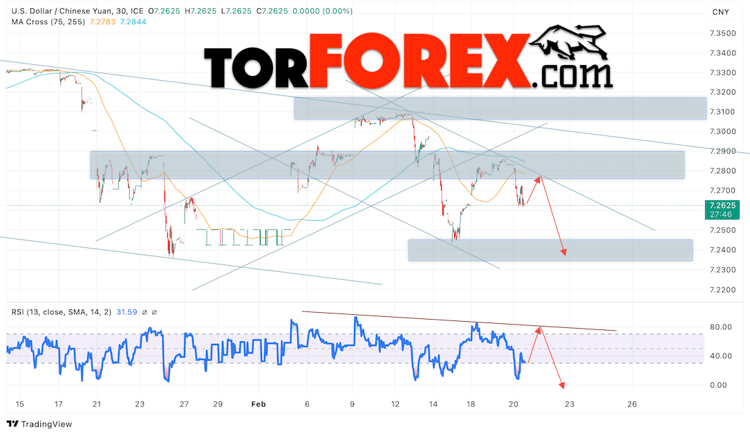 Валютная пара Доллар Китайский Юань USDCNY продолжает движение в рамках развития падения и нисходящего канала. В момент публикации прогноза курс Доллара США к Китайскому Юаню составляет 7.2625. Скользящие средние указывают на наличие краткосрочной медвежьей тенденции. Цены пробили область между сигнальными линиями вниз, что указывает на давление со стороны продавцов американской валюты и потенциальное продолжение падения Доллара США против Китайского Юаня. В рамках прогноза курса Доллара на 21 февраля 2025 стоит ожидать попытку развития бычьей коррекции цены и тест уровня сопротивления вблизи отметки 7.2785 Юаней за Доллар США. Затем, отскок вниз и продолжение падения валютной пары в область ниже уровня 7.2395.