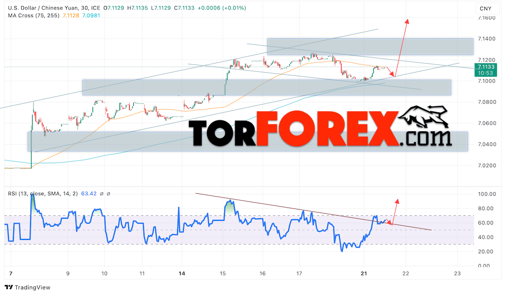 Дополнительным сигналом в пользу подъёма валютной пары USD/CNY 22 октября 2024 выступит тест линии тренда на индикаторе относительной силы (RSI). Вторым сигналом станет отскок от нижней границы бычьего канала. Отменой варианта подъёма пары USD/CNY на Форекс станет падение котировок и пробой уровня 7.0905 Юаней за Доллар. Это укажет на пробой области поддержки и продолжение падения пары Доллар Китайский Юань в область ниже уровня 7.0605. Подтверждением росту пары выступит пробой области поддержки и закрытие котировок актива над уровнем 7.1305, что укажет на пробой верхней границы нисходящего канала коррекции.