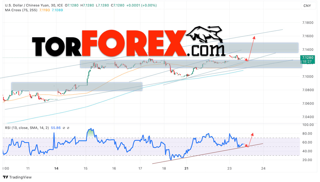 Валютная пара Доллар Китайский Юань USDCNY продолжает движение в рамках роста и бычьего канала. В момент публикации прогноза курс Доллара США к Китайскому Юаню составляет 7.1280. Скользящие средние указывают на наличие краткосрочной бычьей тенденции. Цены пробили область между сигнальными линиями вверх, что указывает на давление со стороны покупателей американской валюты и потенциальное продолжение роста Доллара США против Китайского Юаня. В рамках прогноза курса Доллара на 24 октября 2024 стоит ожидать попытку развития снижения цены и тест уровня поддержки вблизи области 7.1165 Юаней за Доллар США. Затем, отскок вверх и продолжение роста валютной пары в область выше уровня 7.1605.