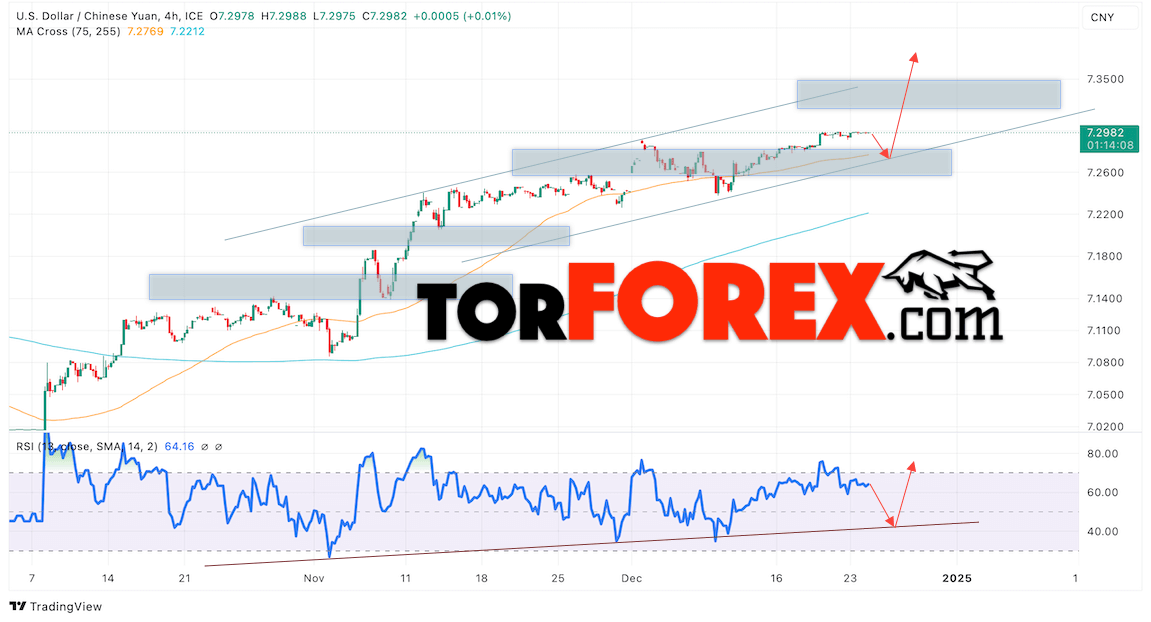 Валютная пара Доллар Китайский Юань USDCNY продолжает движение в рамках развития роста. В момент публикации прогноза курс Доллара США к Китайскому Юаню составляет 7.2982. Скользящие средние указывают на наличие краткосрочной бычьей тенденции. Цены пробили область между сигнальными линиями вверх, что указывает на давление со стороны покупателей американской валюты и потенциальное продолжение роста Доллара США против Китайского Юаня. В рамках прогноза курса Доллара на 25 декабря 2024 стоит ожидать попытку развития падения цены и тест уровня поддержки вблизи отметки 7.2725 Юаней за Доллар США. Затем, отскок вверх и продолжение роста валютной пары в область выше уровня 7.3685.