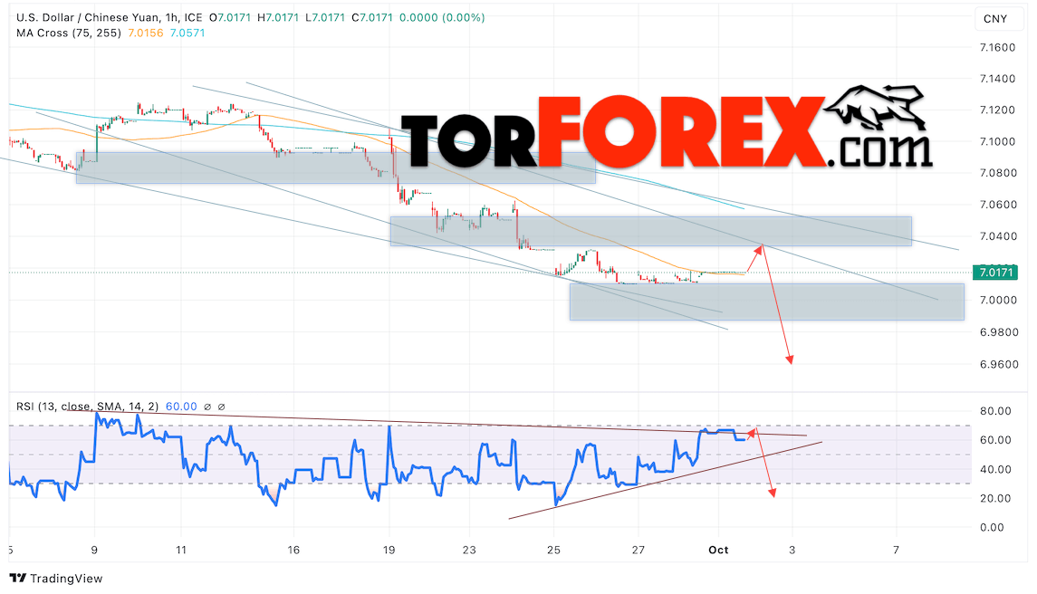 Дополнительным сигналом в пользу подъёма валютной пары USD/CNY 3 октября 2024 выступит тест линии тренда на индикаторе относительной силы (RSI). Вторым сигналом станет отток от верхней границы медвежьего канала. Отменой варианта снижения пары USD/CNY на Форекс станет сильный рост котировок и пробой уровня 7.08 Юаней за Доллар. Это укажет на пробой области сопротивления и продолжение роста пары Доллар Китайский Юань в область выше уровня 7.13. Подтверждением падению пары выступит пробой области поддержки и закрытие котировок актива над уровнем 7.00.