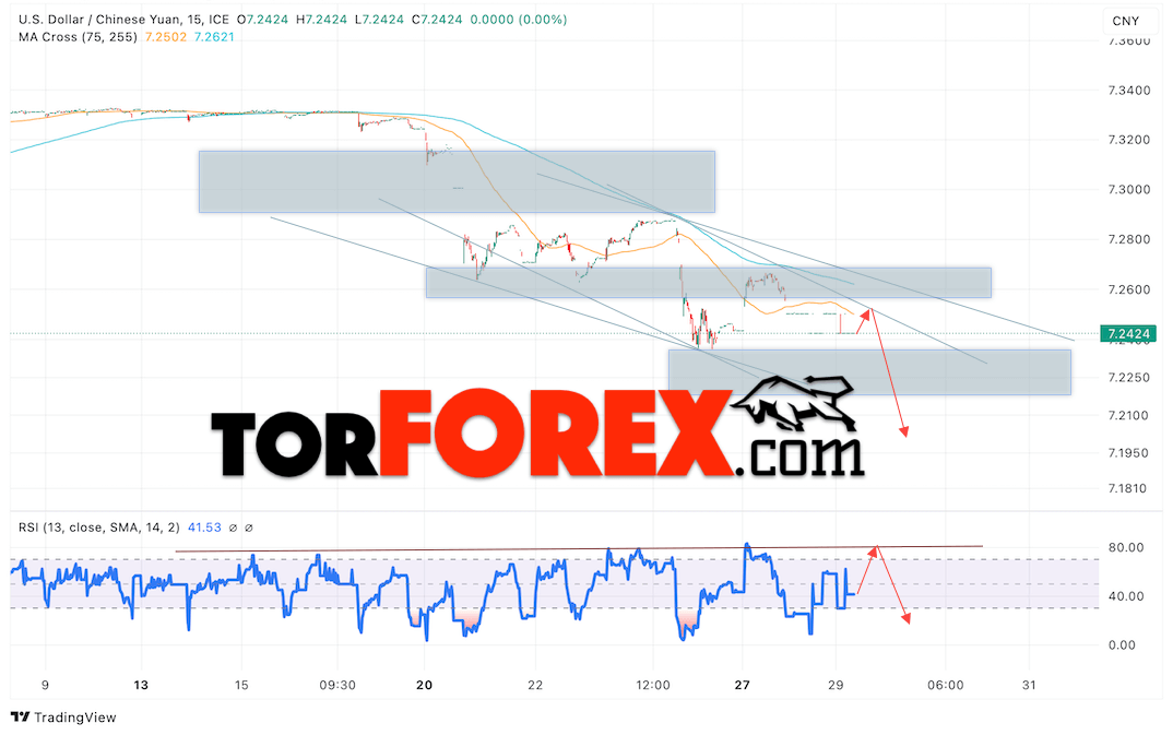 Дополнительным сигналом в пользу подъёма валютной пары USD/CNY 30 января 2025 выступит тест нисходящей линии тренда на индикаторе относительной силы (RSI). Вторым сигналом станет отскок от верхней границы медвежьего канала. Отменой варианта с ростом пары USD/CNY на Форекс станет падение котировок и пробой уровня 7.2825 Юаней за Доллар. Это укажет на пробой области сопротивления и продолжение роста пары Доллар Китайский Юань в область выше уровня 7.3265. Подтверждением падению валютной пары выступит пробой области поддержки и закрытие котировок актива под уровнем 7.2335.