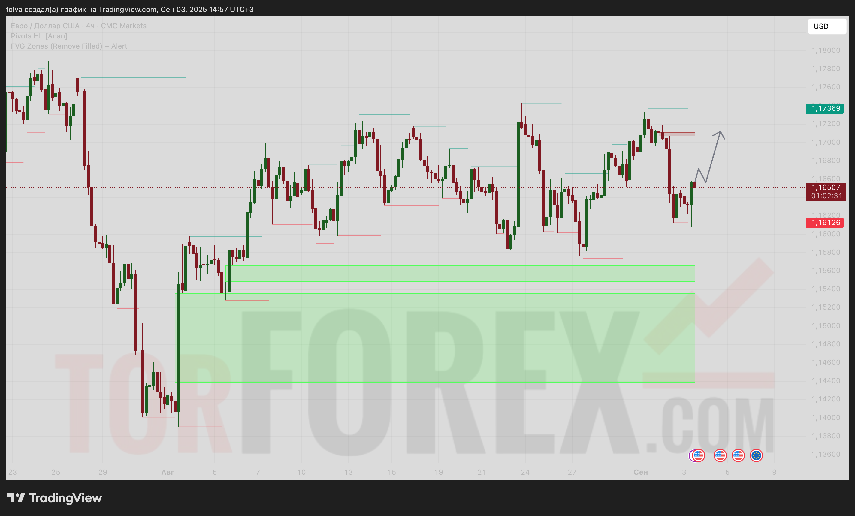При закреплении ниже 1,1610 пара может продолжить снижение к 1,1580. Прорыв этого диапазона усилит давление продавцов и приведёт к тестированию более широкой FVG-зоны в области 1,1500–1,1450.